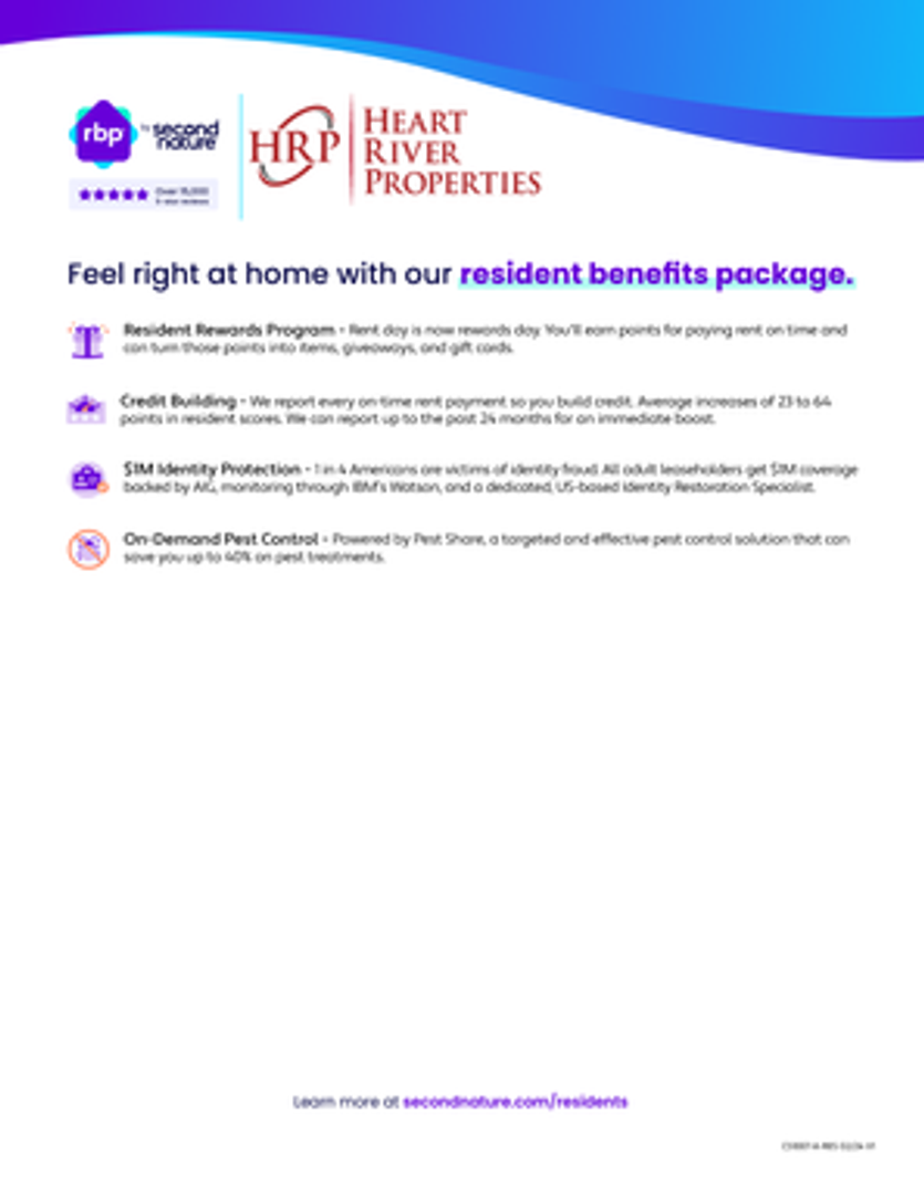 *At Heart River Properties Inc, we strive to provide an experience that is cost-effective and convenient. That’s why we provide a Resident Benefits Package (RBP) to address common headaches for our renters. Our program handles pest control, credit building and more at a rate of $40.00/month, available to every eligible property upon resident election. More details upon application.