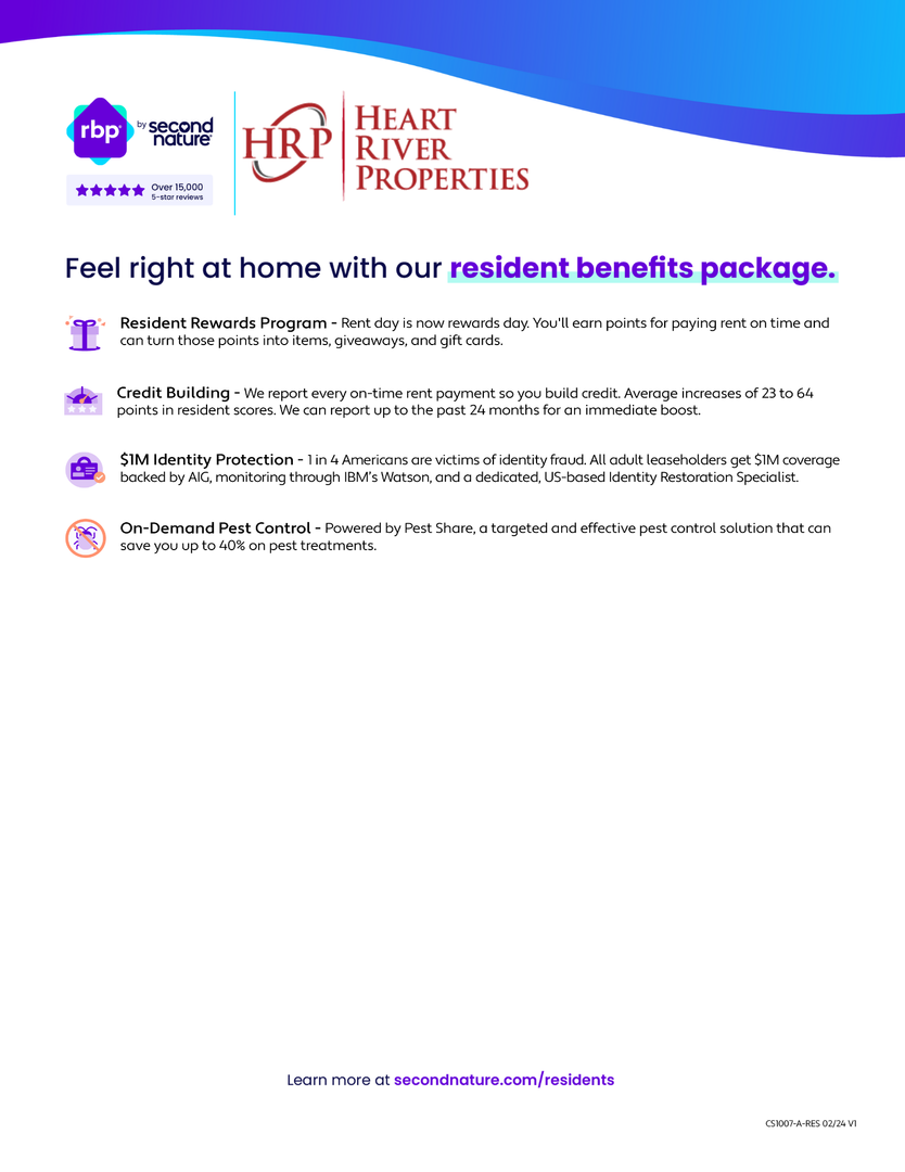 *At Heart River Properties Inc, we strive to provide an experience that is cost-effective and convenient. That’s why we provide a Resident Benefits Package (RBP) to address common headaches for our renters. Our program handles pest control, credit building and more at a rate of $40.00/month, available to every eligible property upon resident election. More details upon application.